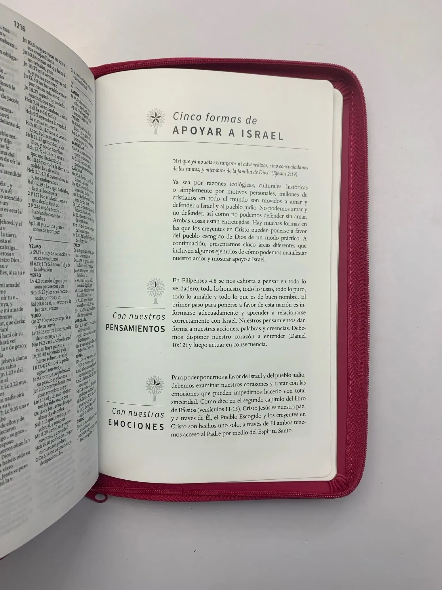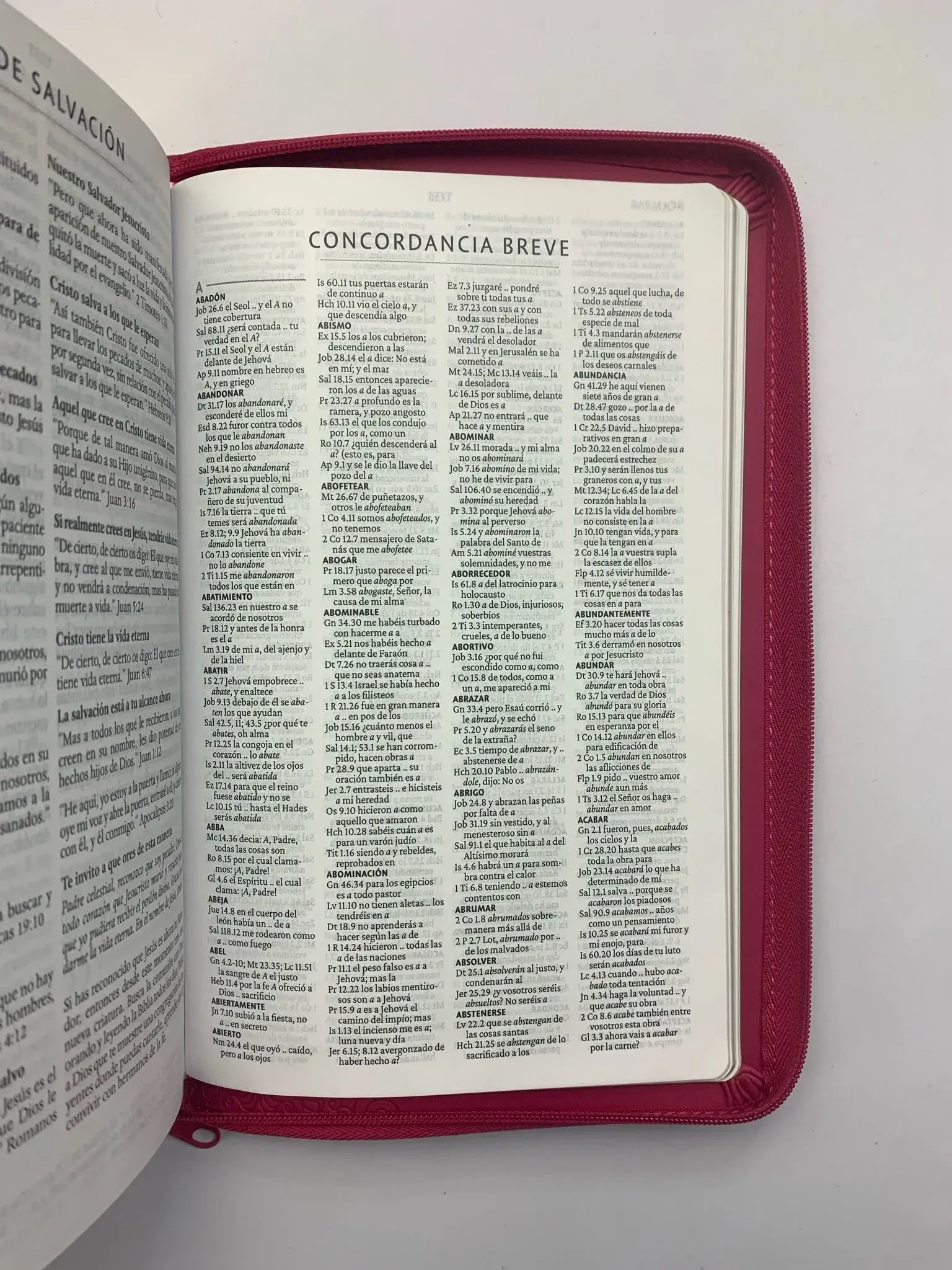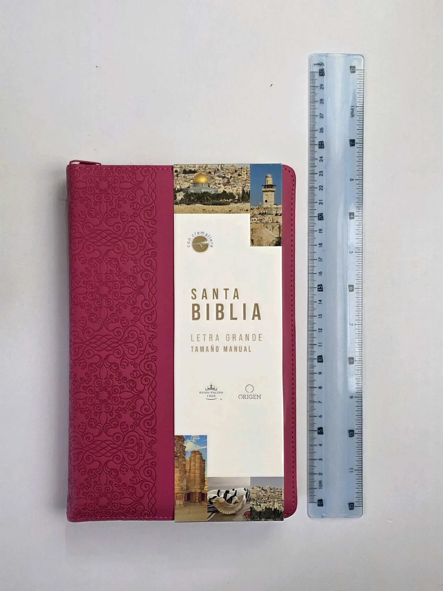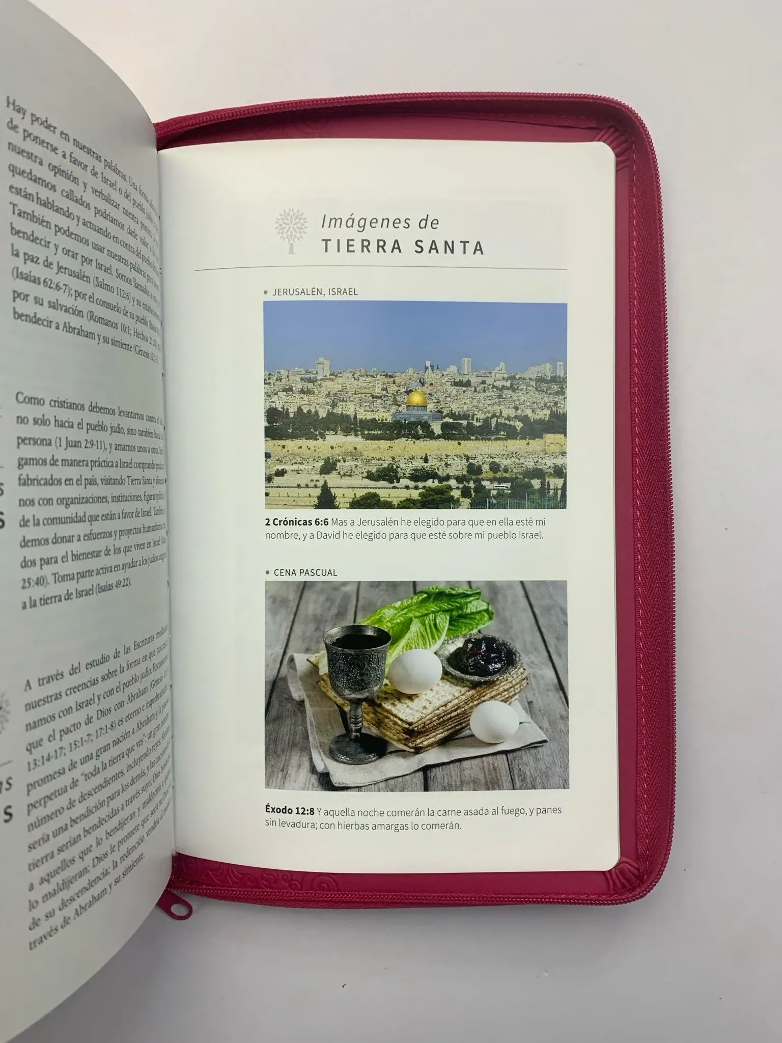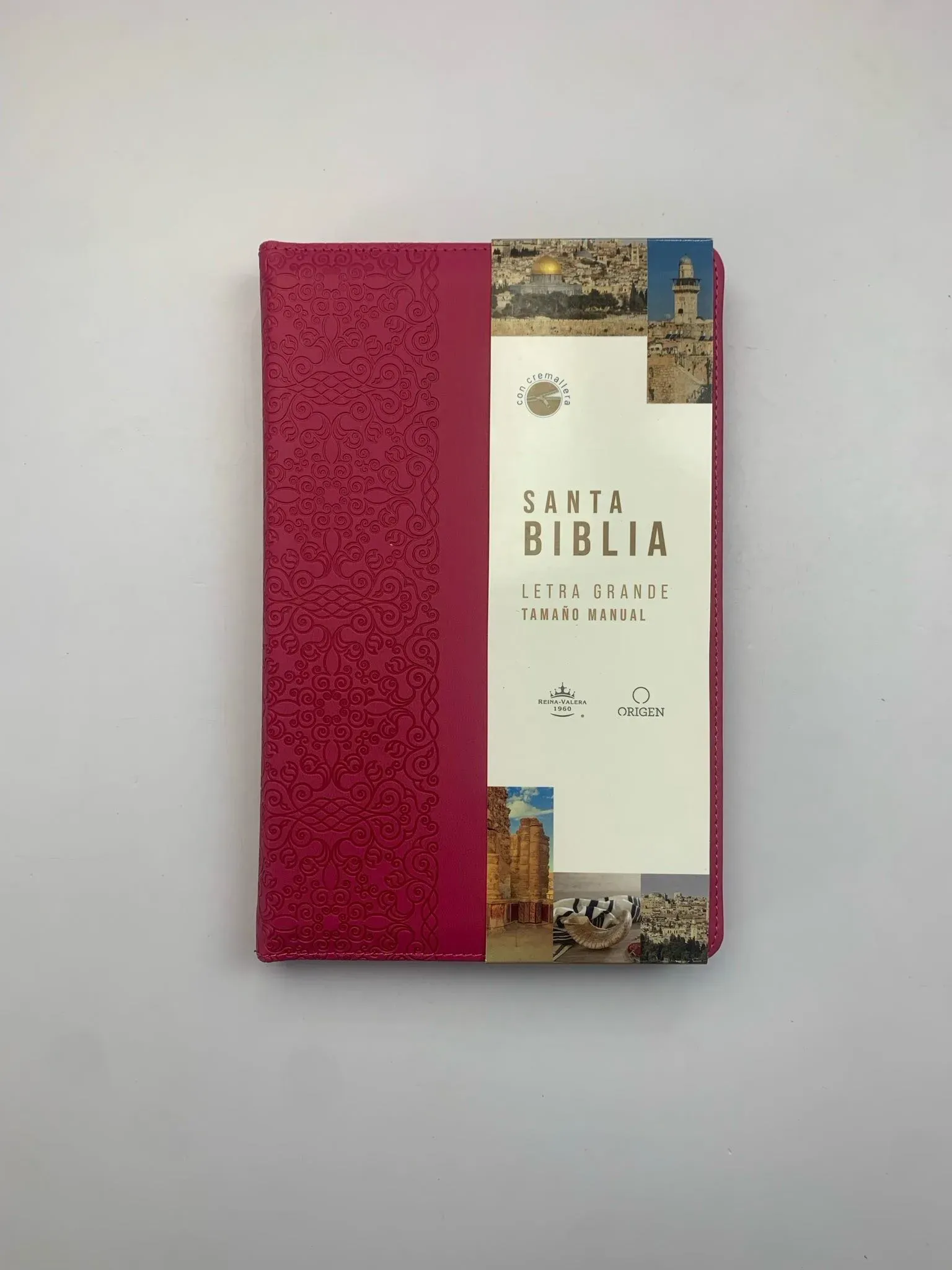 Biblia tamaño manual con letra grande. Símil piel fucsia con cremallera, con canto dorado, cinta marcadora y fotos a color de Tierra Santa....