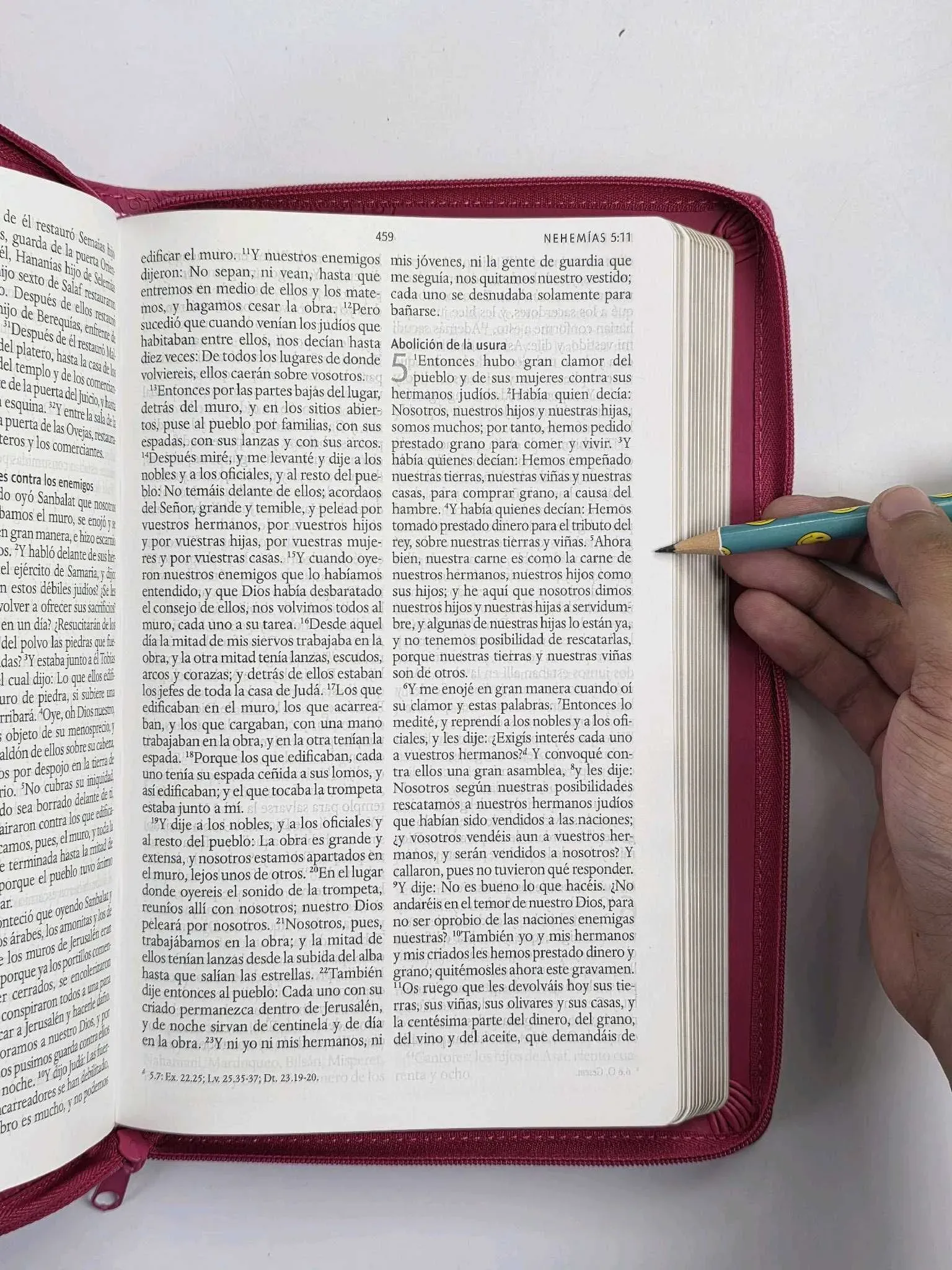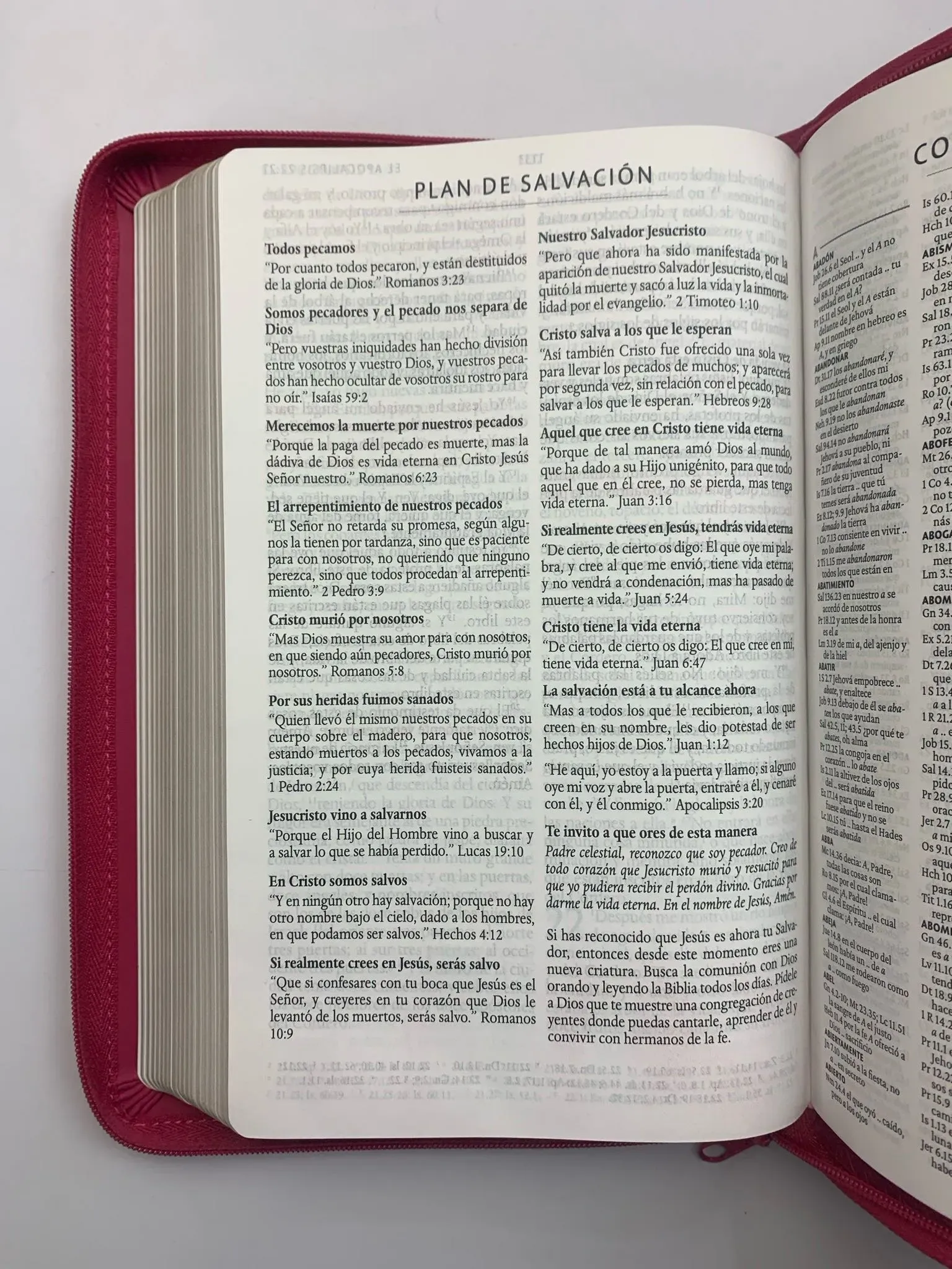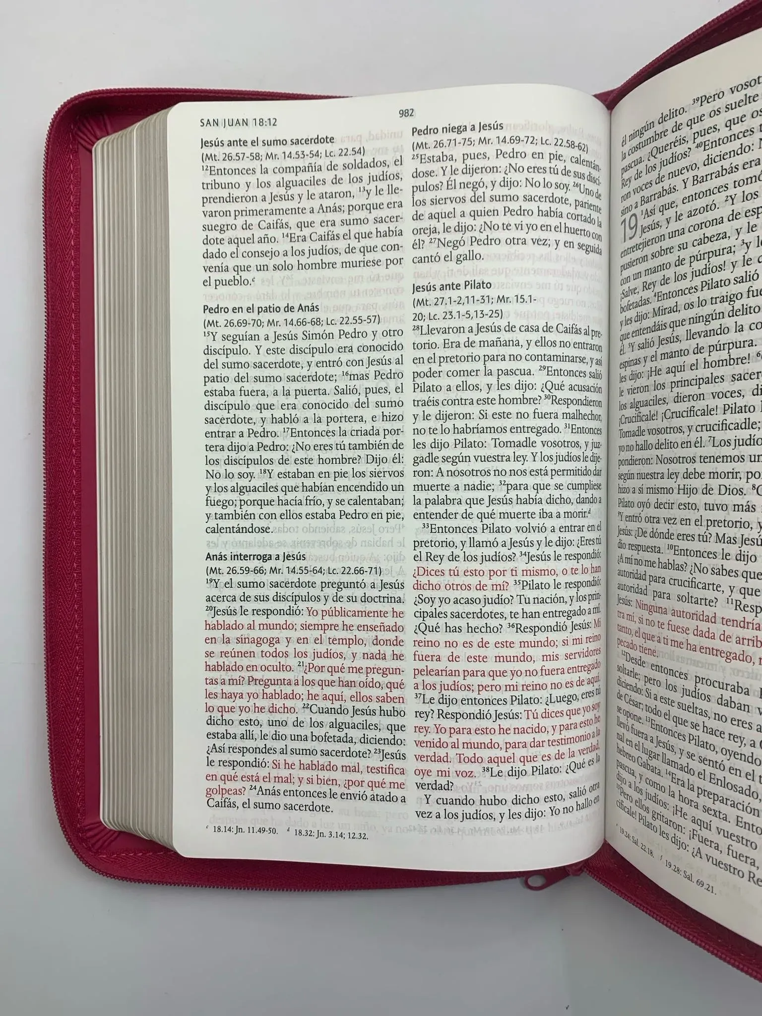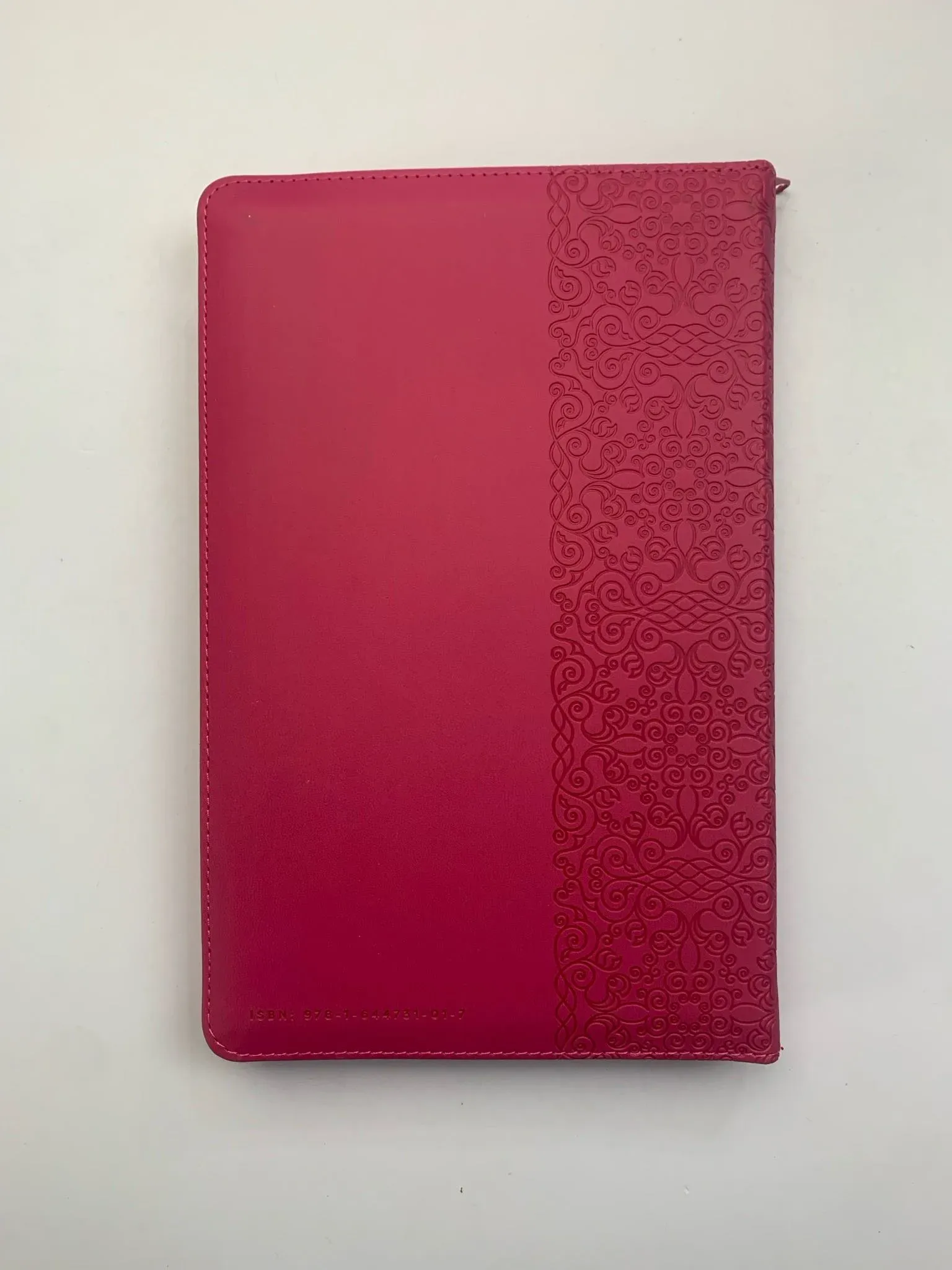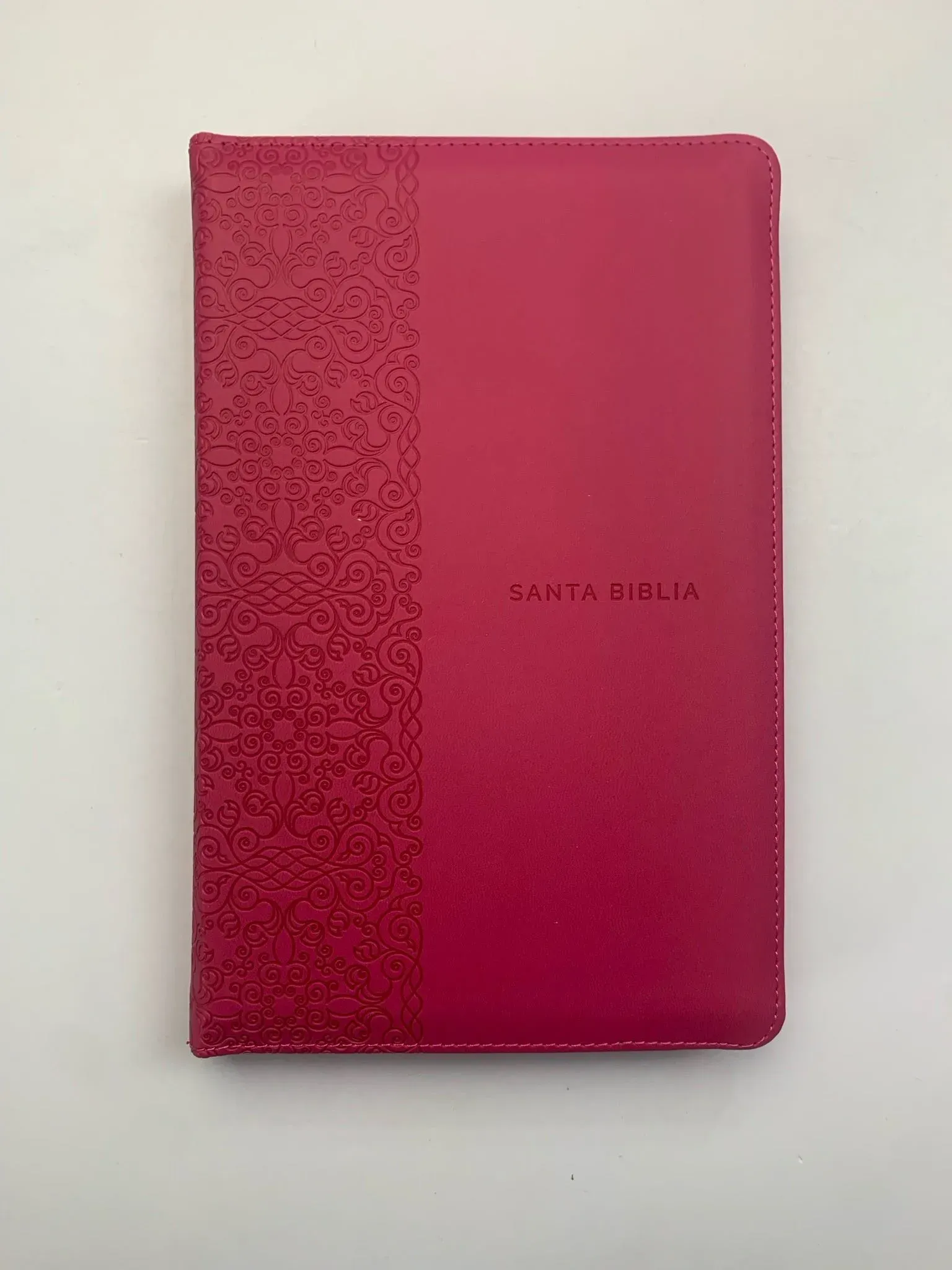 Biblia tamaño manual con letra grande. Símil piel fucsia con cremallera, con canto dorado, cinta marcadora y fotos a color de Tierra Santa....