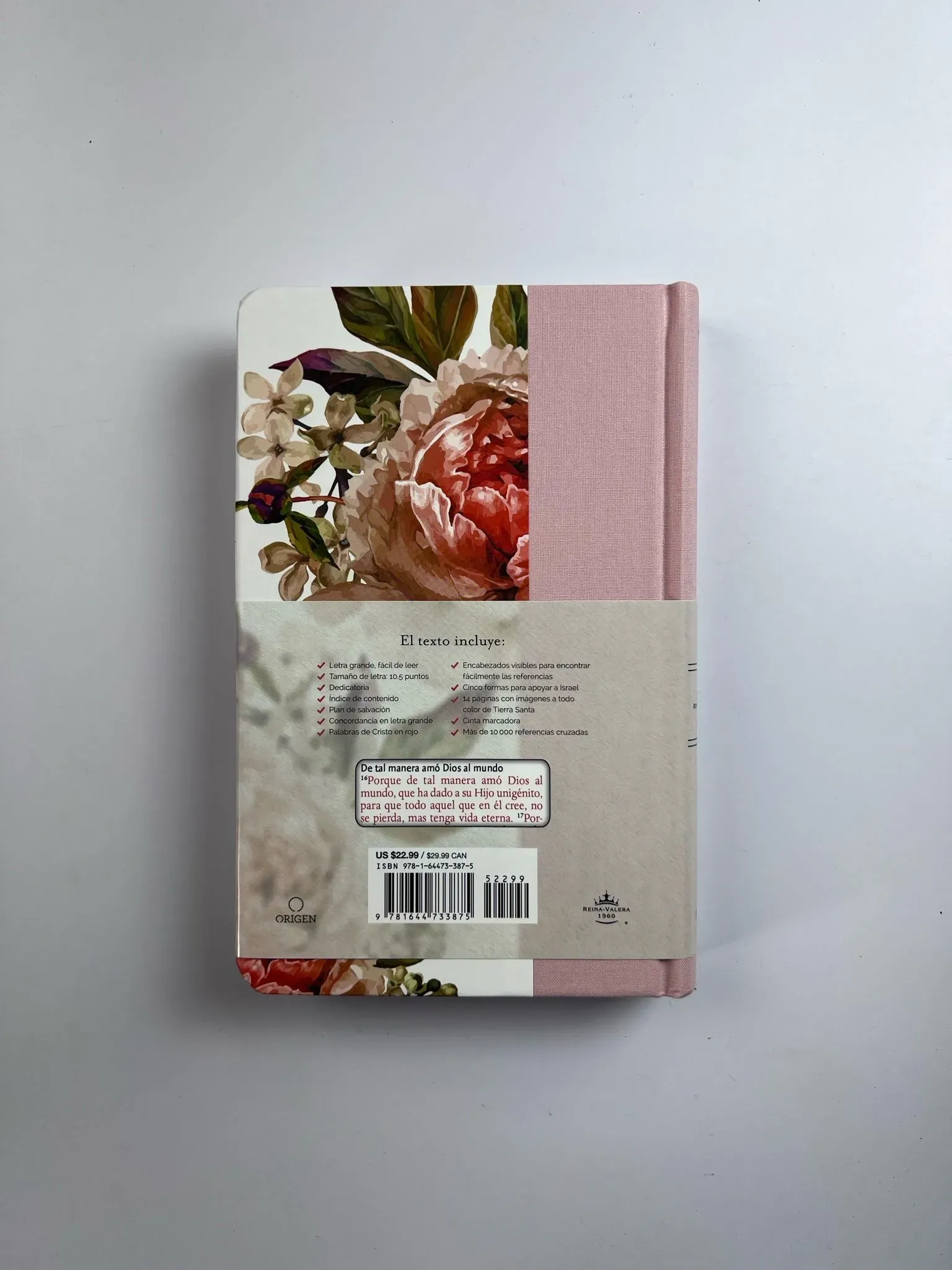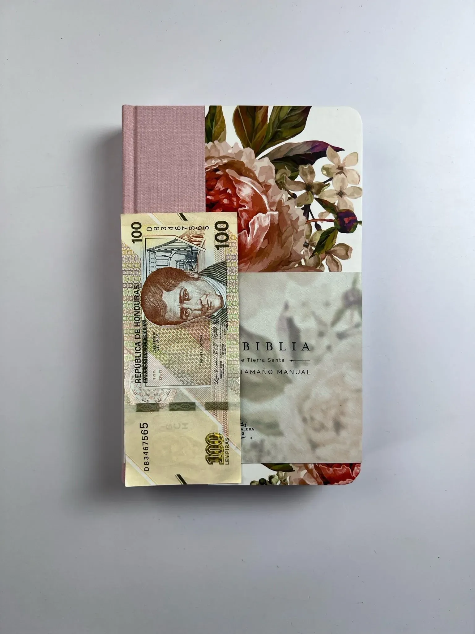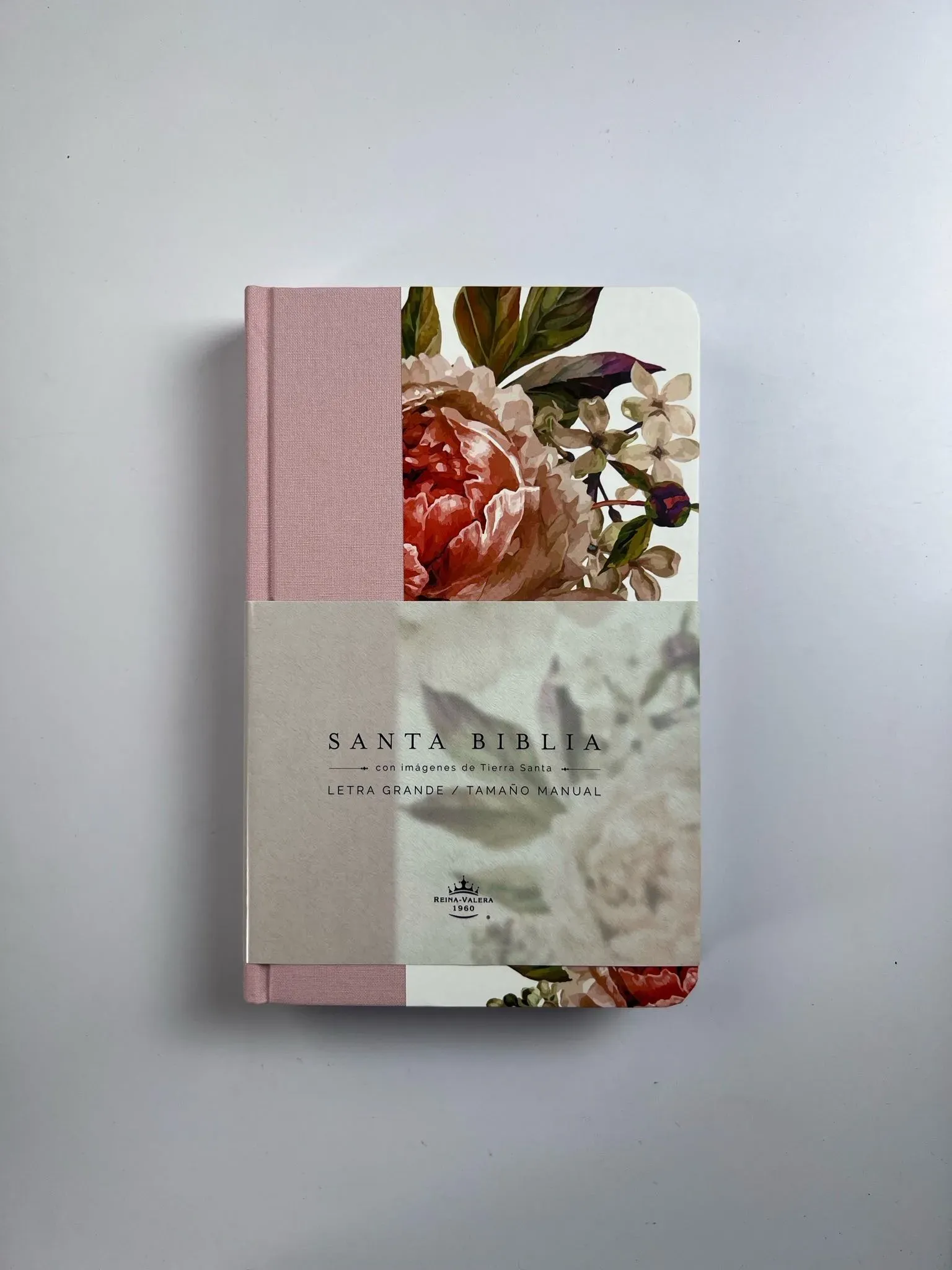 Biblia tamaño manual, ultrafina y con letra grande. Tapadura con tela rosada y flores, cinta marcadora y fotos a color de Tierra Santa.