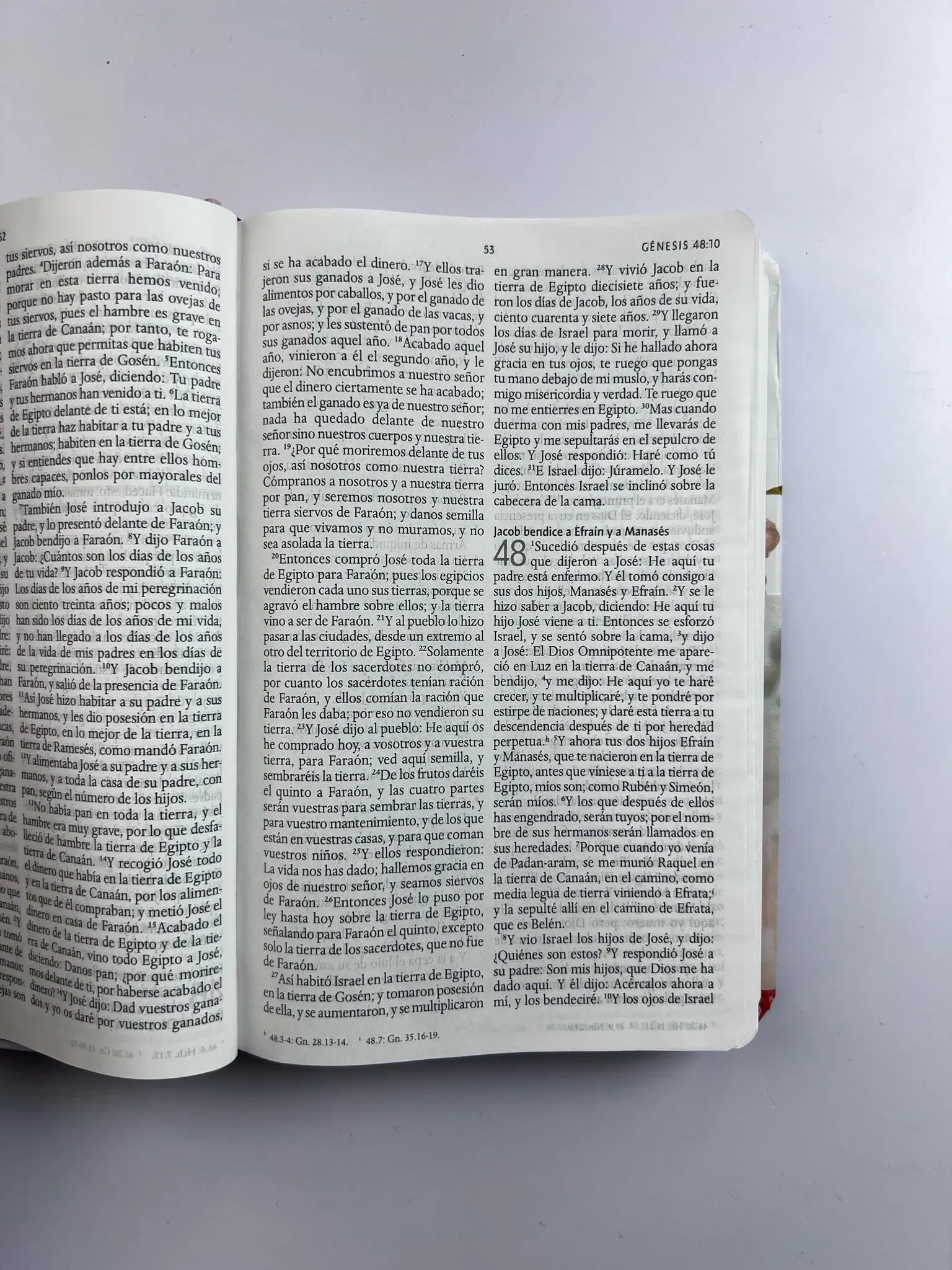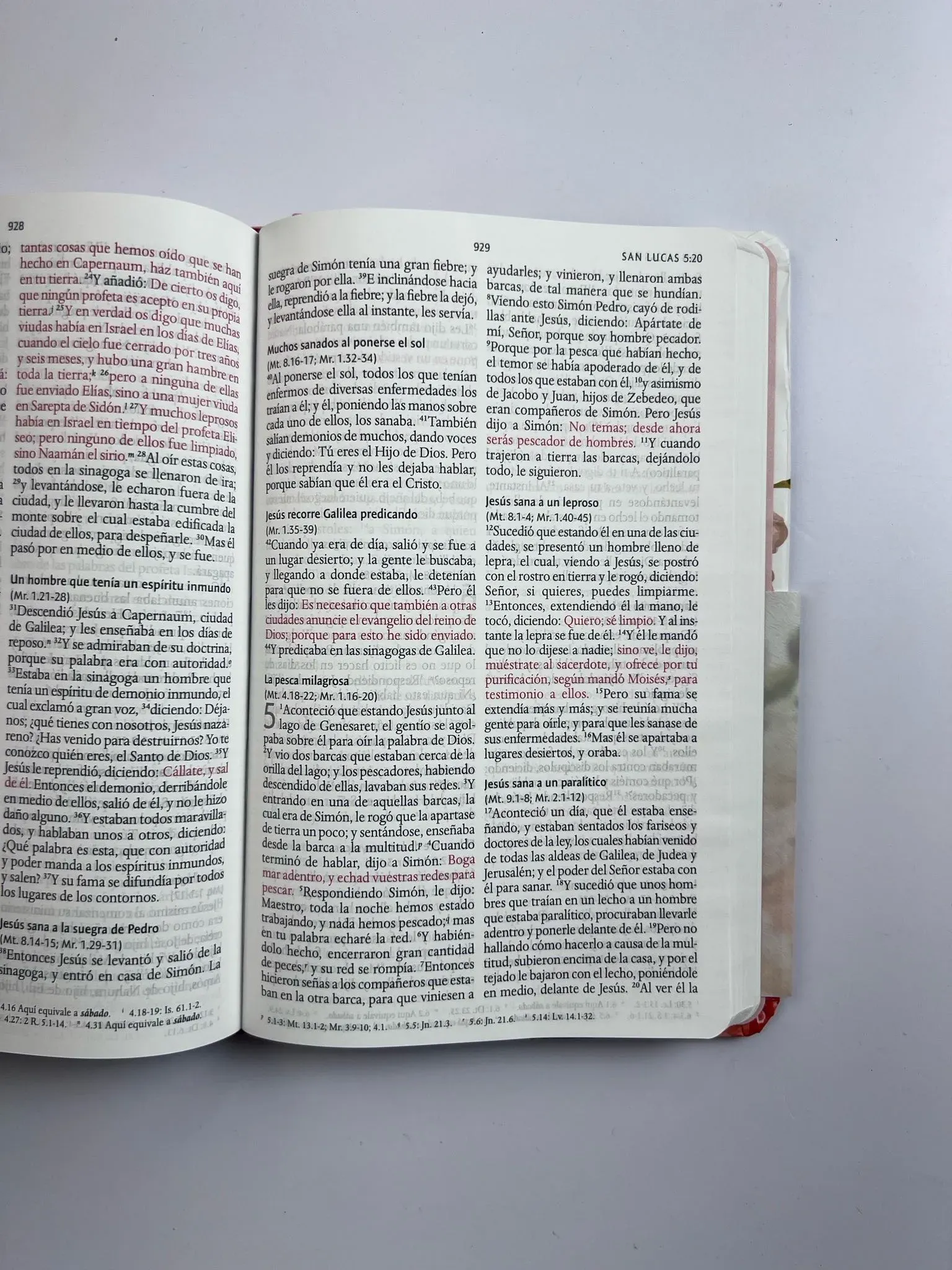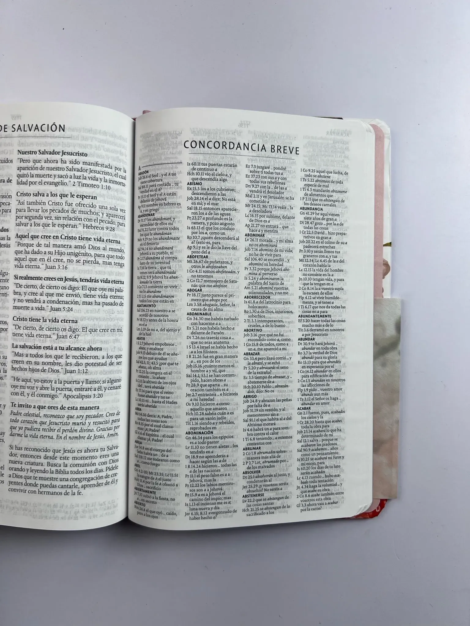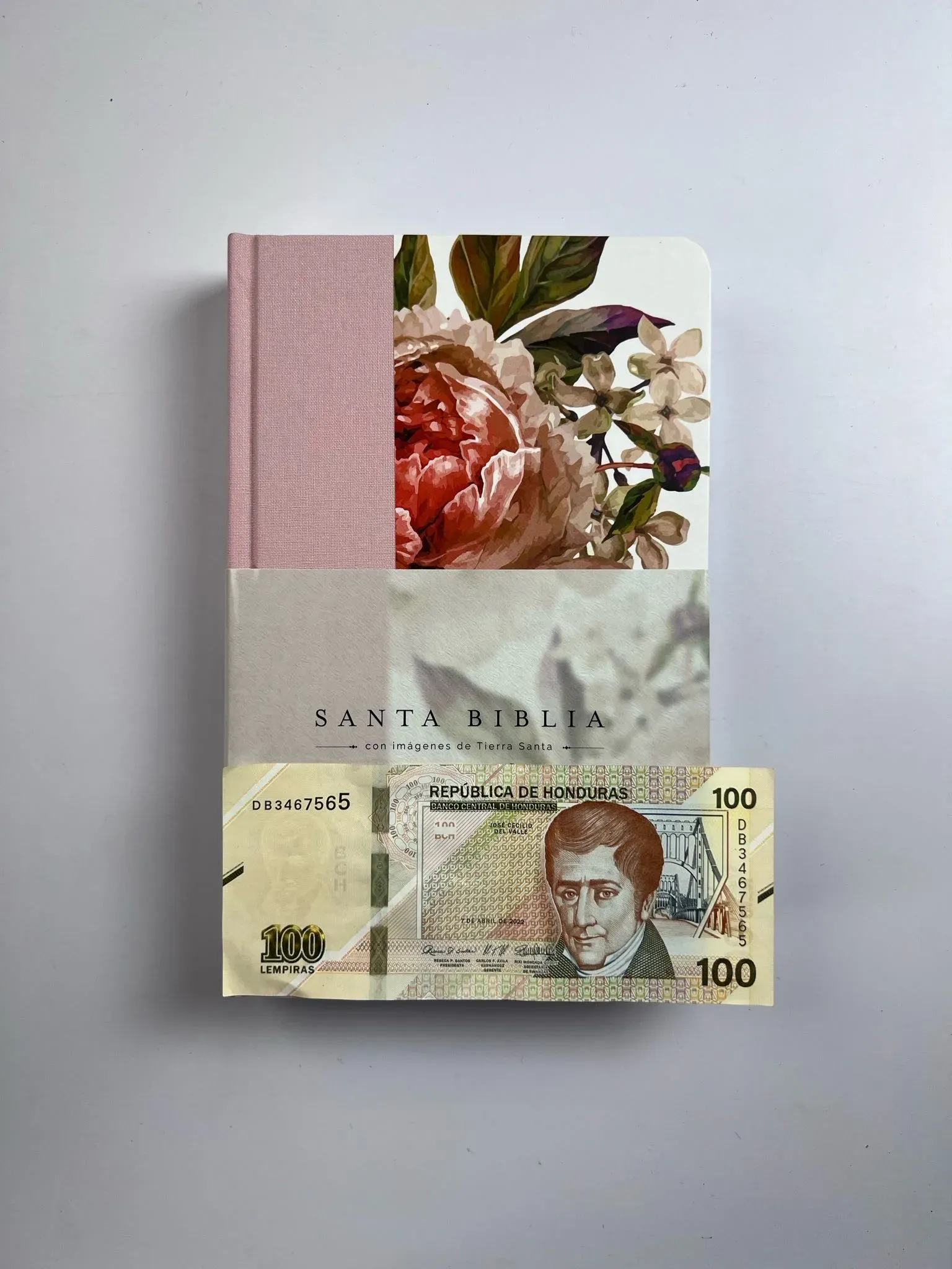 Biblia tamaño manual, ultrafina y con letra grande. Tapadura con tela rosada y flores, cinta marcadora y fotos a color de Tierra Santa.