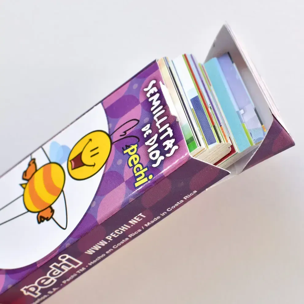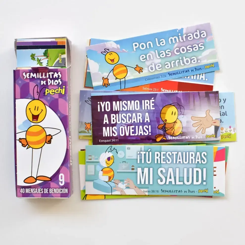 Cada cajita trae 40 tarjetitas diferentes, todos con versículos bíblicos hermosos, que cae como una semillita a nuestros corazones necesitados de esa palabra divina. Mide 8.2 cm de ancho por 3.1 cm de alto, viene empacado de bolsita con hueco para colgar.