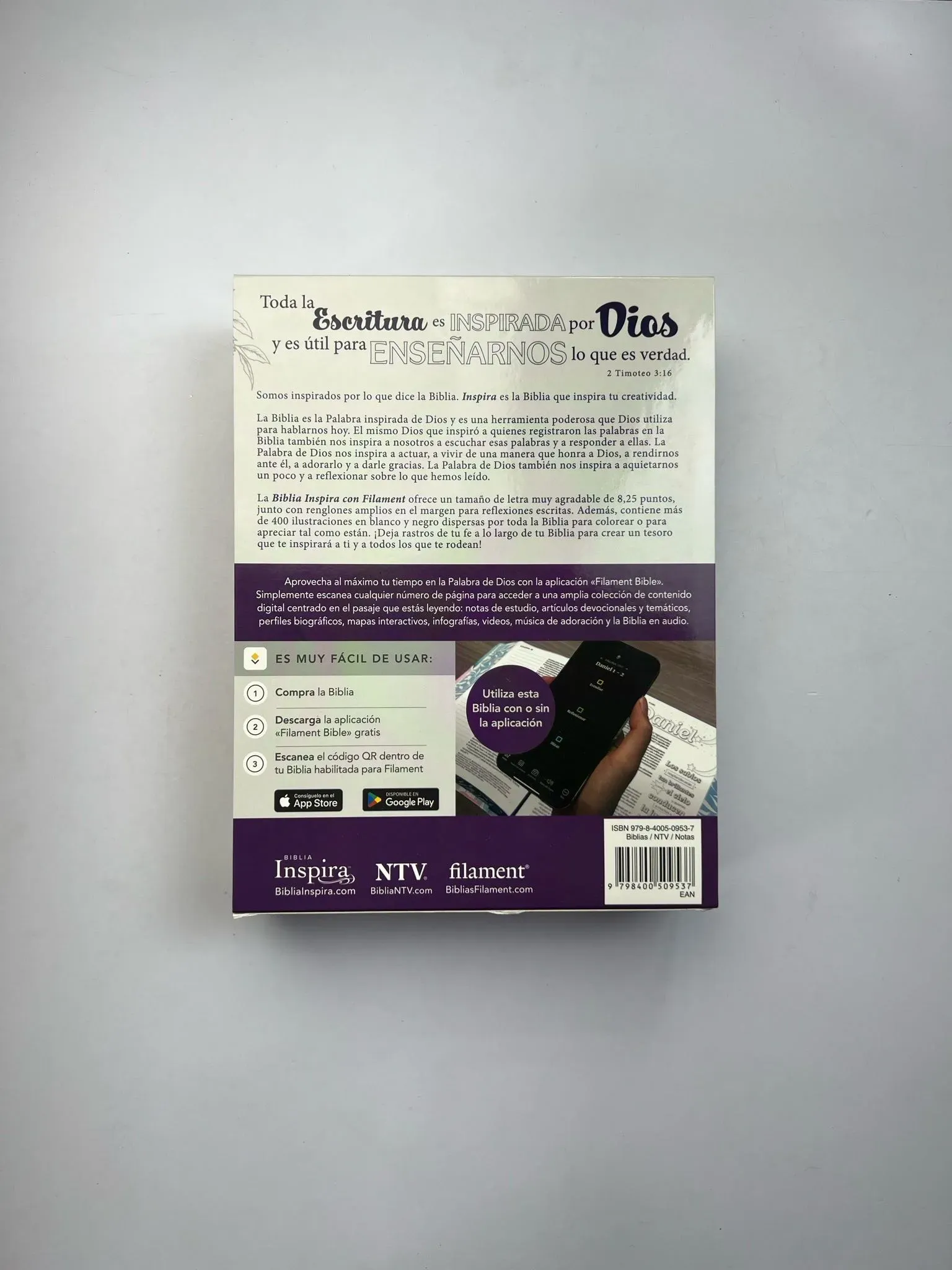 La Biblia Inspira NTV es la versión en español de la Inspire Bible, la Biblia para colorear más vendida. Diseñada completamente en español, esta Biblia utiliza el texto de la Nueva Traducción Viviente en una sola columna y amplio margen con más de 400 hermosas ilustraciones en blanco y negro para in...