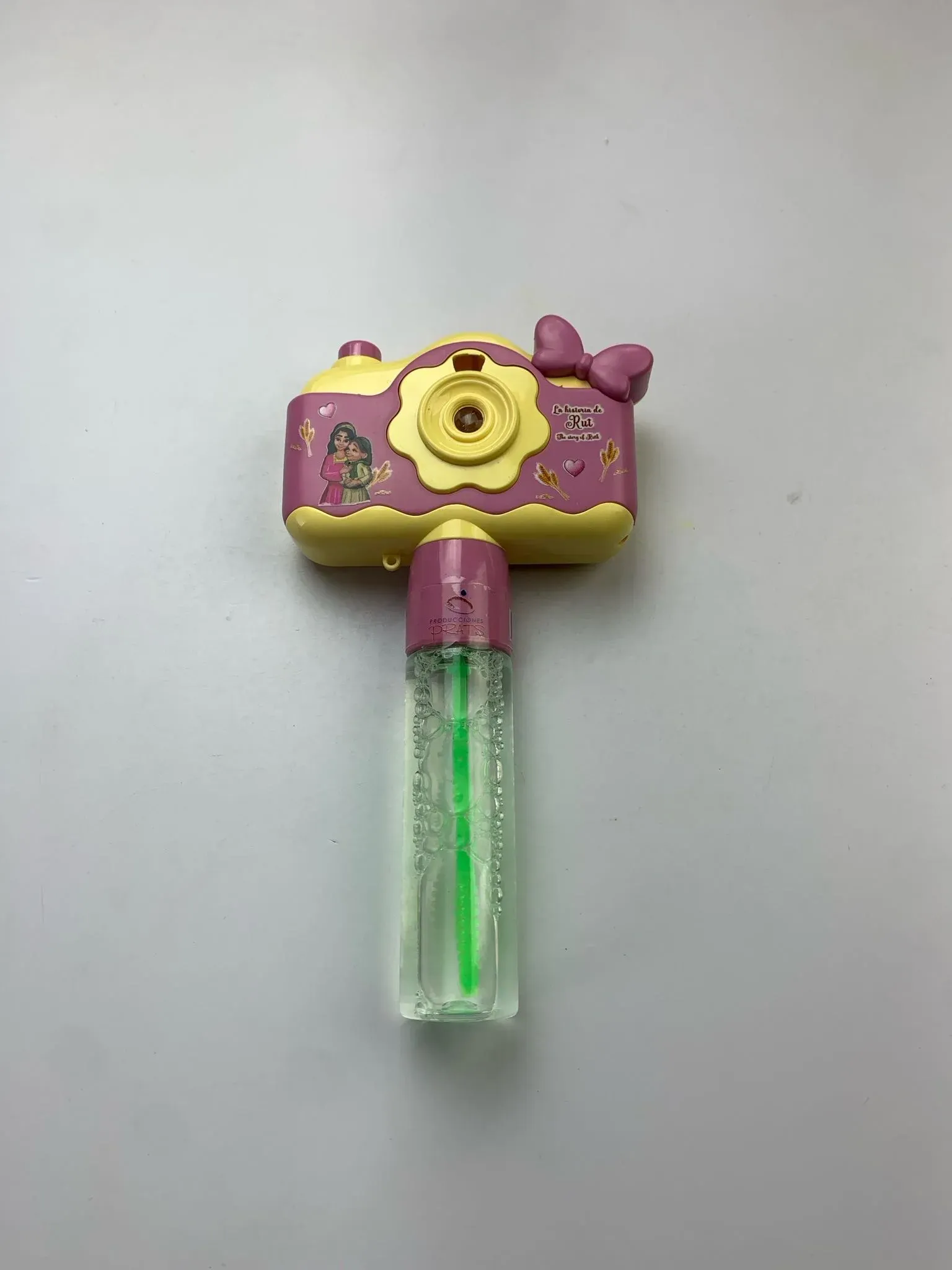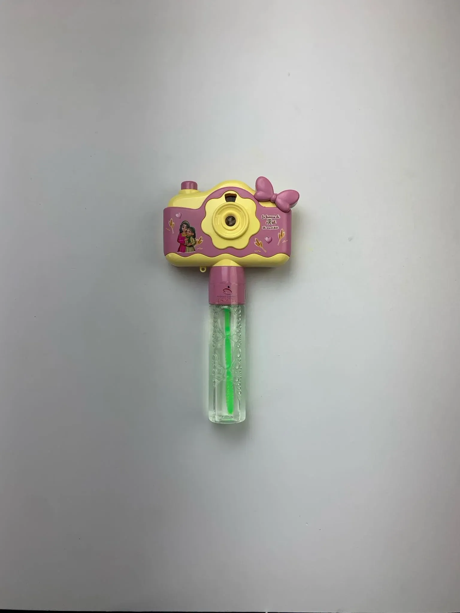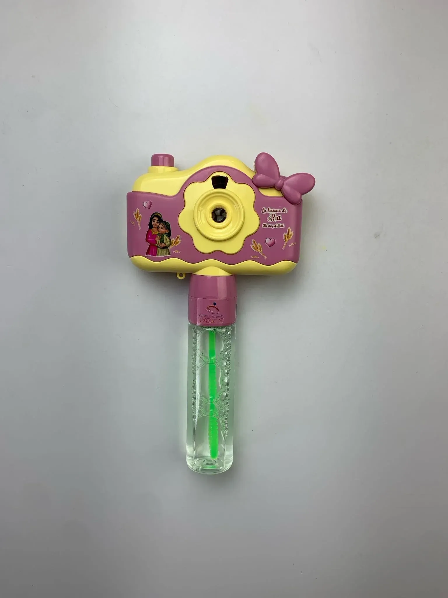Los pequeños pasarán maravillosos momentos con este juguete multifunción que visualiza y proyecta imágenes con la historia de un personaje bíblico, además es un burbujero.